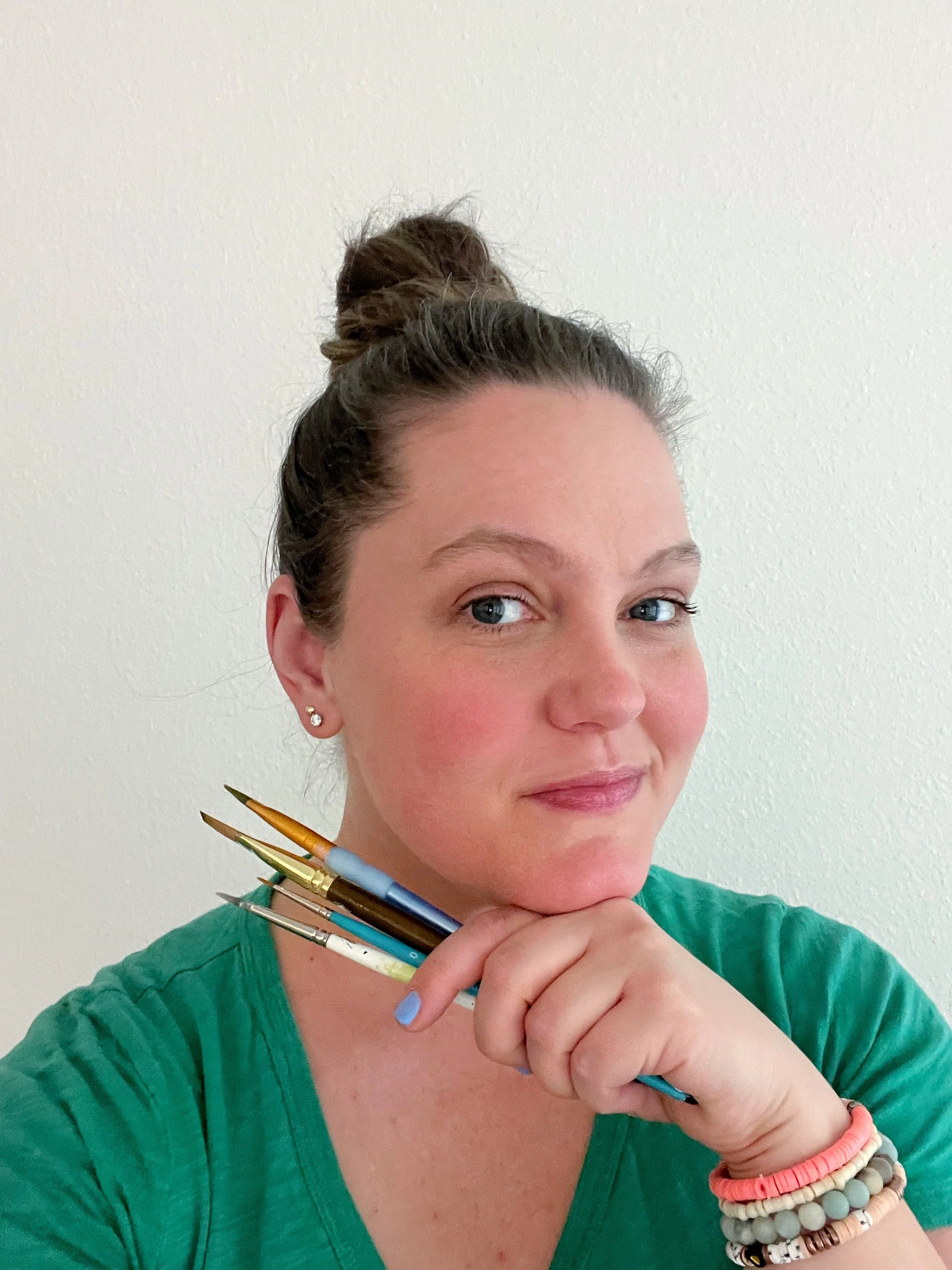 I spend my days in Orlando, Florida, with my husband and two wonderful kids. I have been painting since I was just four years old. My artistic journey took me to Winthrop University, where I earned a Bachelor’s Degree in Illustration. I spent many years in corporate graphic design before ultimately leaving to create my own space. After dedicating over 11 years to my Etsy shop and unsure of what to do next, I decided it was time to step back from creating new watercolor art and custom calligraphy work. I hoped to embrace the precious moments of family life, especially after welcoming our youngest child in 2023. Those quiet nights spent soothing my son to sleep, next to a painting from my college days, ignited a spark within me — I realized how much I missed acrylic painting.